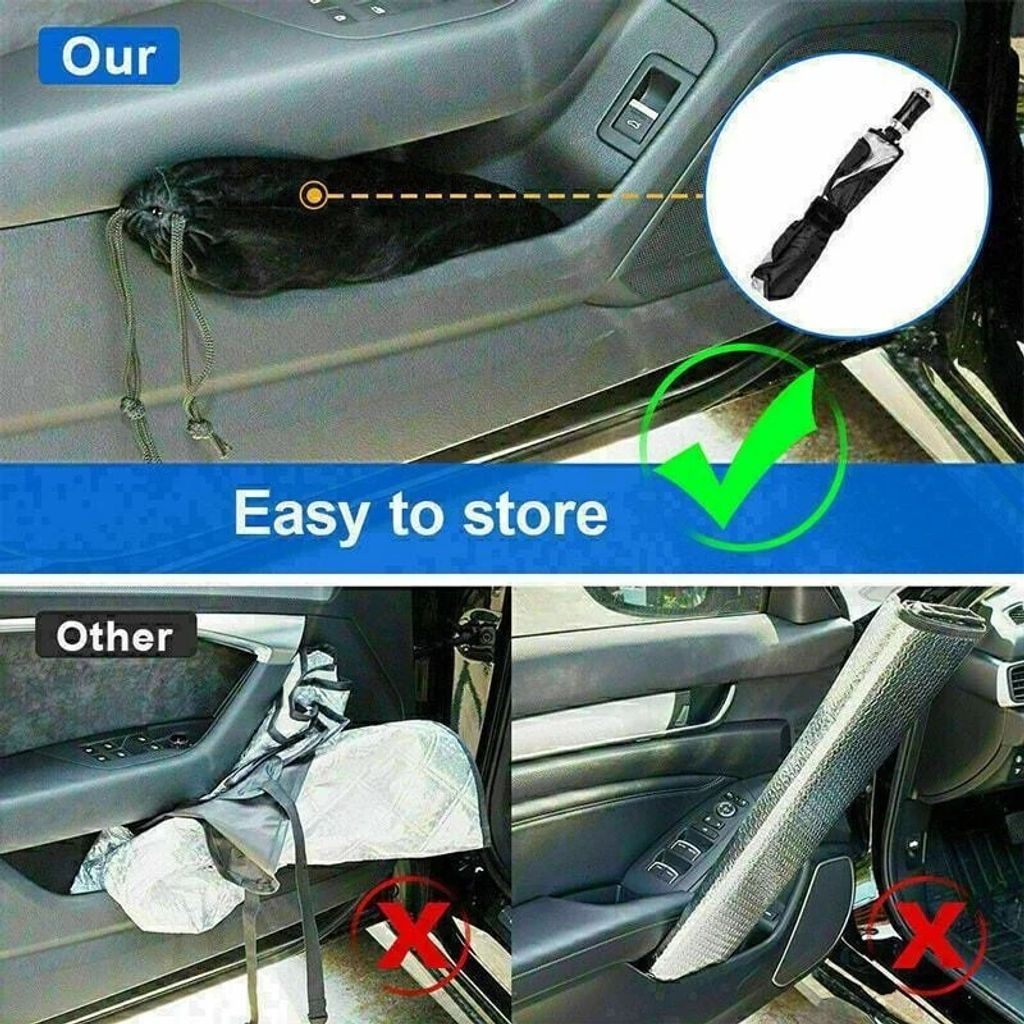 auto sunshade umbrella is foldable, very easy to open and close. It’s super space-saving and time-saving for daily use. -
